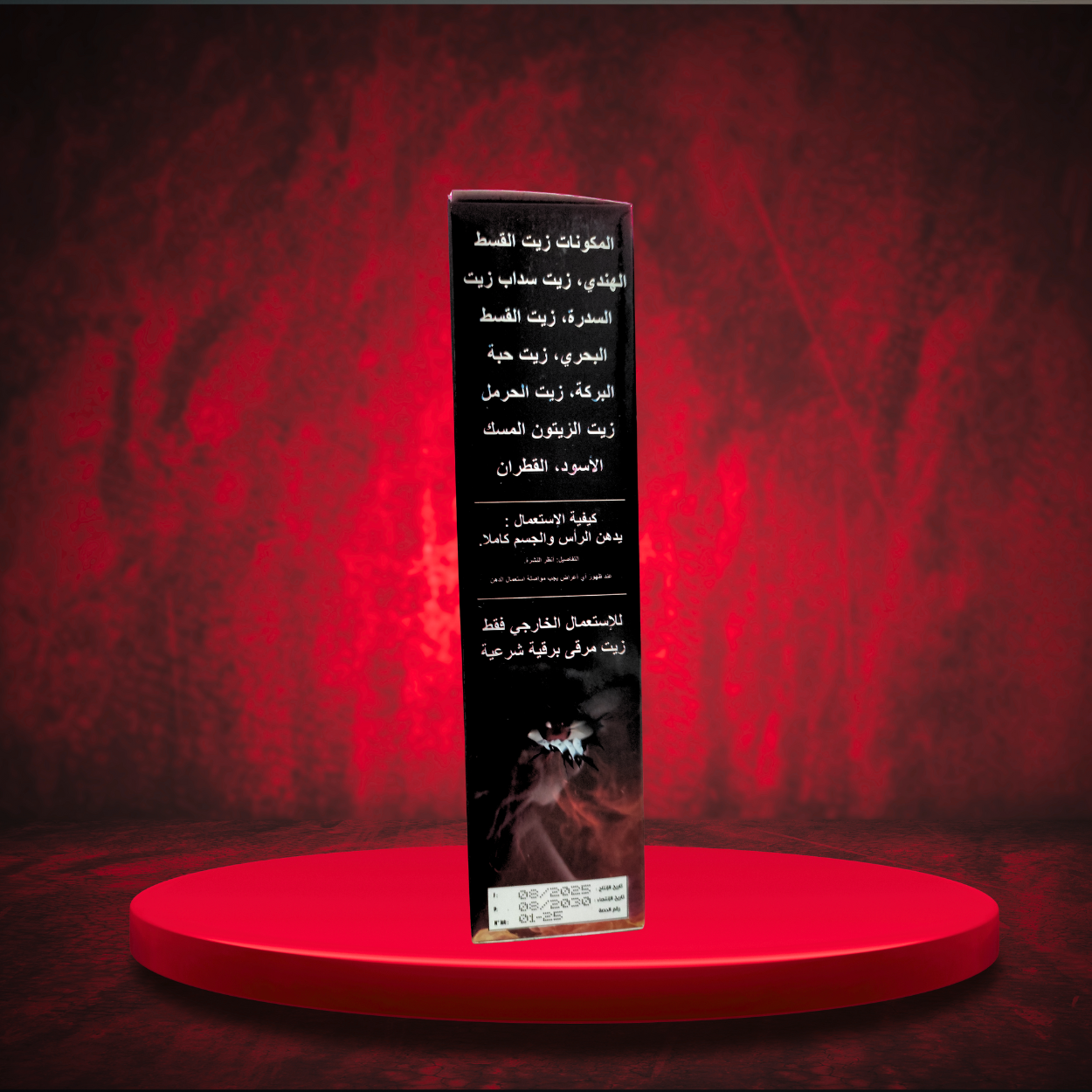 Ingrédients : Huile de Costus indien / Huile de Rue officinale / Huile de jujubier / Huile de costus marinus / Huile de Graines de nigelle / Huile de Harmala / Huile d’olive /Huile de séné mécquois / Extrait de lentistique / Huile de cade / Musc noir.