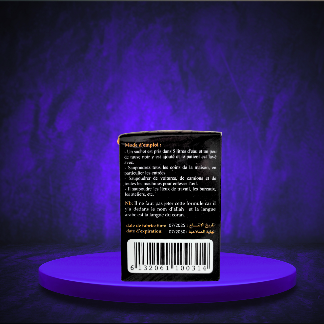 Ce mélange a été conçu dans le but d'annuler tout sihr et 'ain ainsi que la mess (posséssion), il a été expérimenté. Son usage est exclusivement externe, à ne pas ingérer !