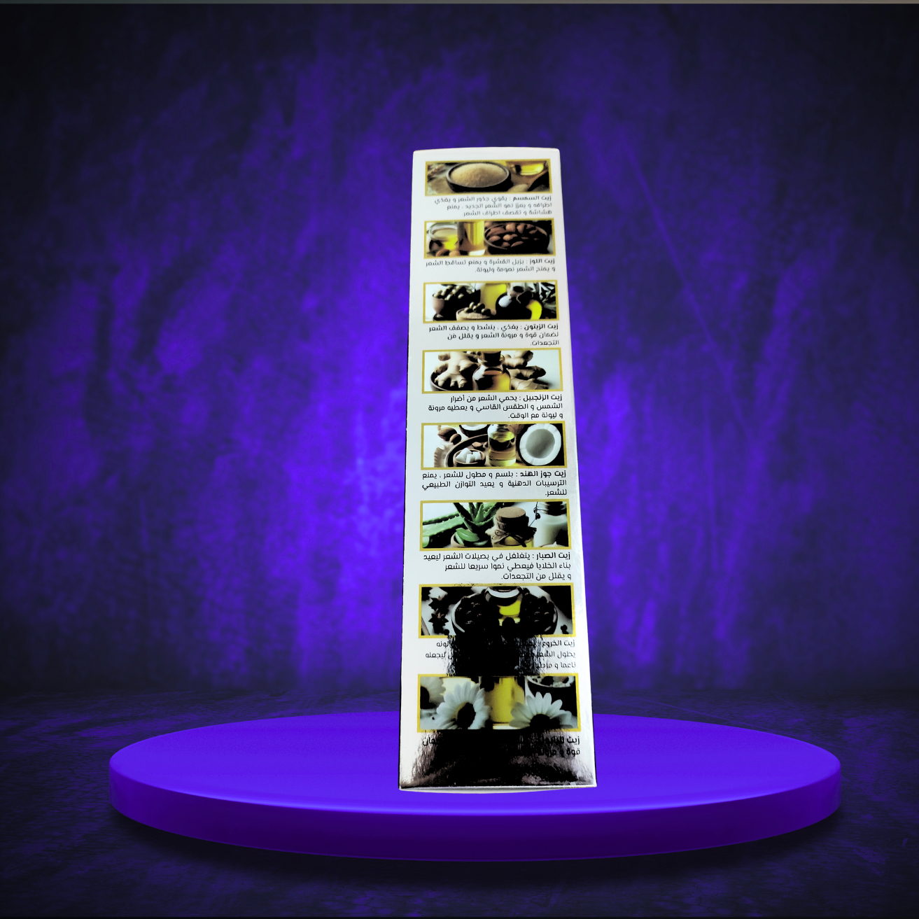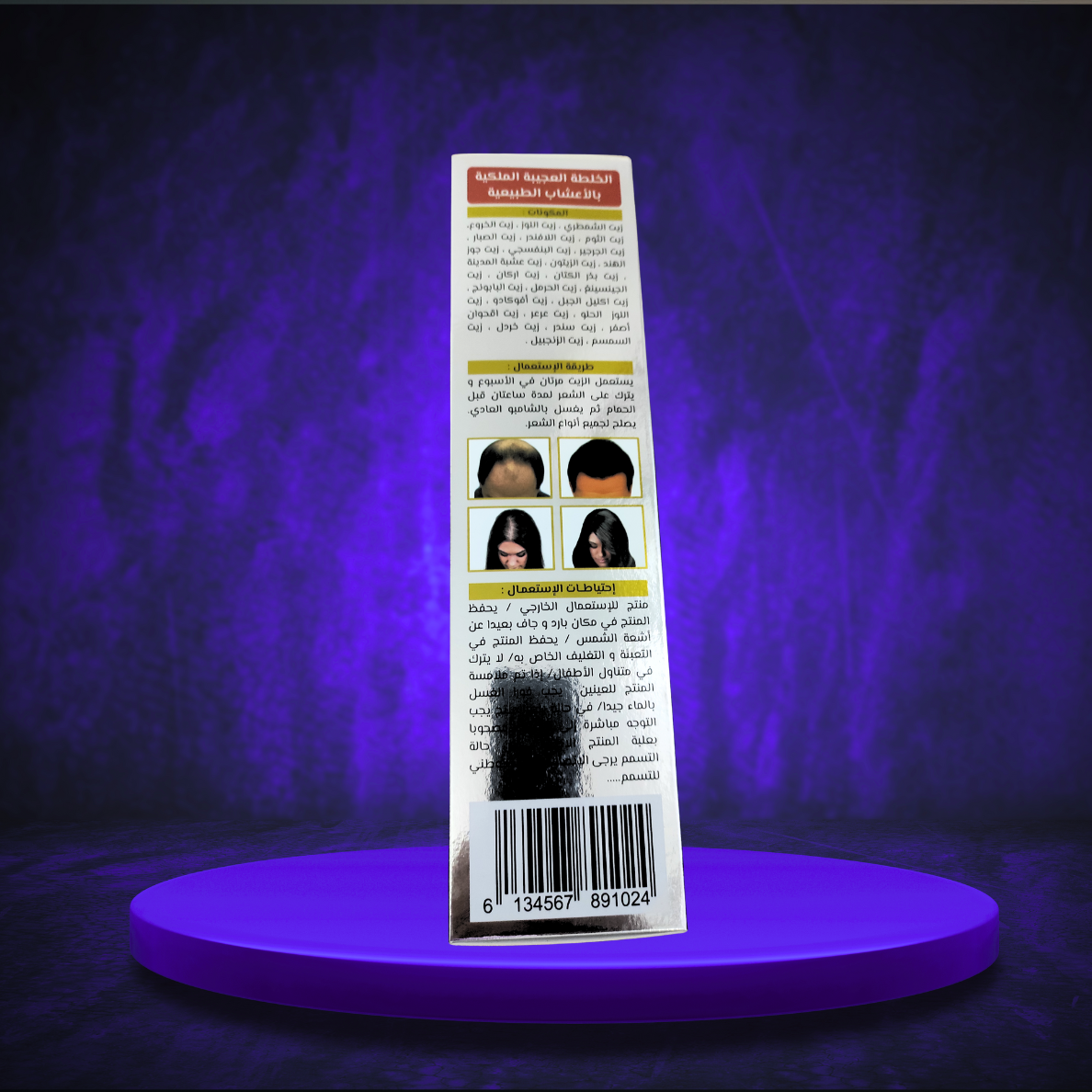 Composition : Huile d'amande, Huile de ricin, Huile d'ail, Huile de lavande, Huile d'aloé vera, Huile de roquette, Huile de violette, Huile de coco, Huile d'olive, Huile plante de Medine (inconnu), Huile de graine de lin, Huile d'argan, Huile de ginseng, Huile de peganum (harmal), Huile d'amla, Huile de romarin, Huile d'avocat, Huile d'amande non amère, Huile de genievre, Huile de jujubier, Huile de sésame, Huile de camomille, Huile de Gingembre, Huile de moutarde, Huile de Shmatri....
